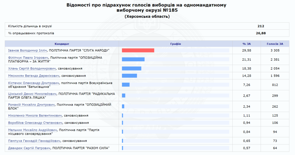 Согласно предварительным данным, по одномандатному избирательному округу №185 на внеочередных парламентских выборах побеждает представитель президентской партии «Слуга народа» Владимир Иванов. Об этом информирует сайт Центральной избирательной комиссии.
