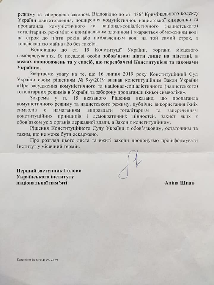В Институте считают, что самый уникальный и масштабный памятник Херсонщины подлежит немедленному сносу, поскольку символизирует коммунистический тоталитарный режим. Также в письме напоминают о криминальной ответственности, которая настигнет каховскую власть за невыполнение Закона — ограничение свободы сроком до 5 лет и конфискация имущества.