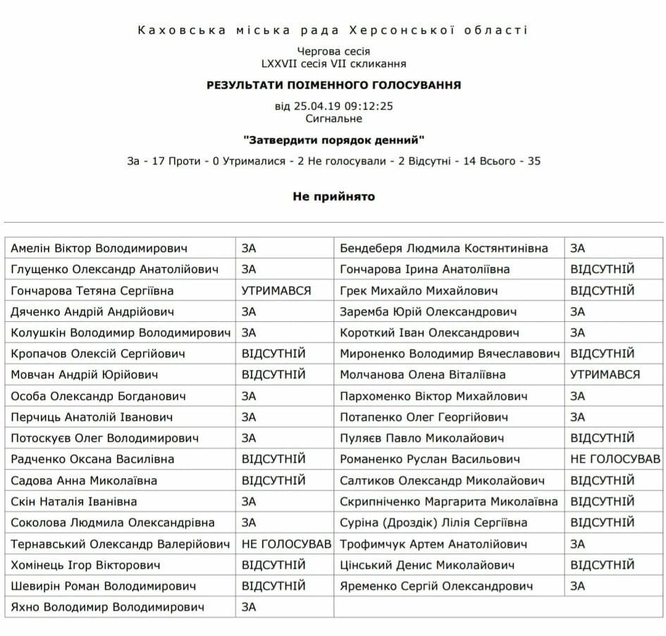 Так, трое представителей «Батькивщины» (Р. Романенко, А. Тернавский и Т. Гончарова) и депутат от «Оппоблока» Е. Молчанова воздержались от голосования. Причину отказа принимать повестку дня они не объяснили.