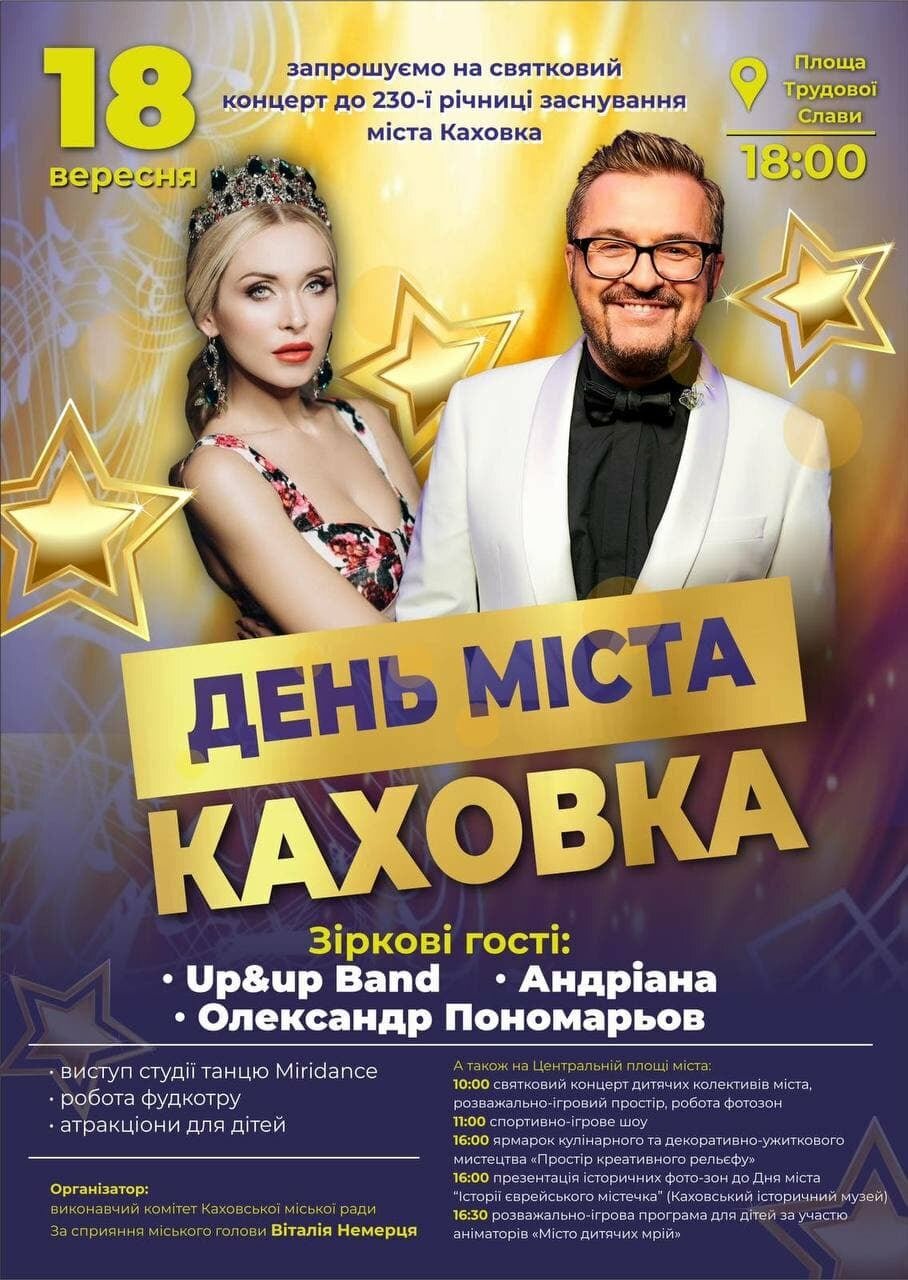 В Каховке празднование 230 годовщины Дня города пройдет с приглашенными столичными звездами. Сообщается, что 18 сентября на площади Трудовой славы выступит украинский певец и народный артист Украины Александр Пономарев.
